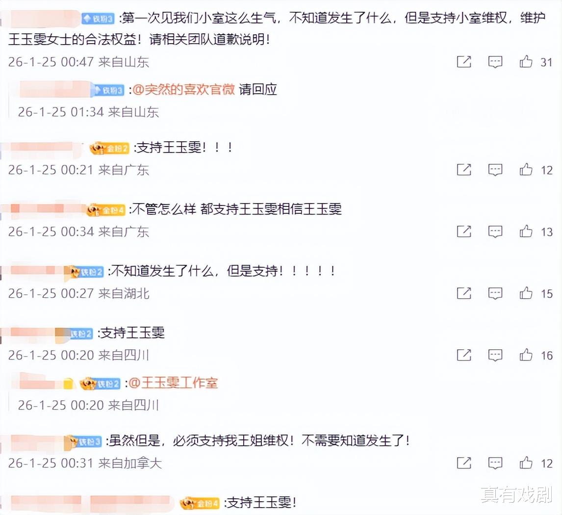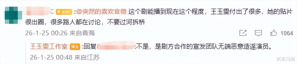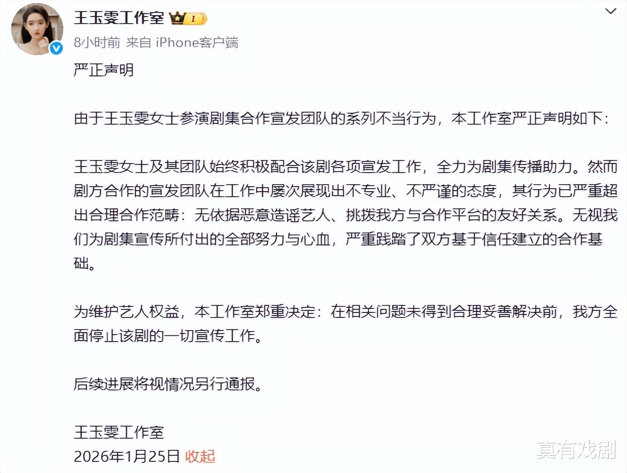 1月25日凌晨,王玉雯工作室全平台发布严正声明,宣布全面停止该剧一切宣传工作,矛头直指剧方合作宣发团队的恶意造谣与挑拨行为。