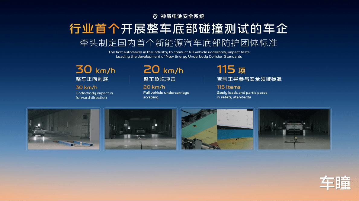 神盾电池安全系统在行业内第一个做到30km/h托底冲击、20km/h整车负坎冲击都无损伤,解决电动车最怕的因底部碰撞带来的电池损伤和安全事故。早在2021年,吉利就携手国家权威机构,牵头制定了国内首个新能源汽车底部防护的团体标准。将于2026年7月1日起施行的《电动车用动力蓄电池安全要求》,也新增了电池底部撞击等测试标准。截至今年3月,吉利主导参与安全领域的各项标准已达115项。