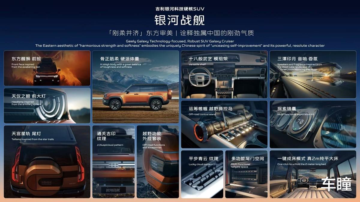 发布会上,吉利智能安全科技的集大成者——银河战舰迎来全球首发。银河战舰在设计上不仅展现了“刚柔并济”的东方审美,更诠释了独属于中国人“自强不息”的刚劲气质。形似“浑天仪”的前大灯、勾勒“天宫星轨”的尾灯,灵感来自“游艇操纵杆”的越野操控岛等设计等,均展现了吉利银河“涟漪美学”在智电时代的硬派表达。
