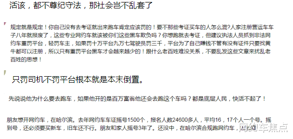 另一部分人则提出,很多司机是在平台招募下进入这个行业的,平台明知司机没有营运资格仍派单运营,被查后责任却全由司机承担,这不公平。