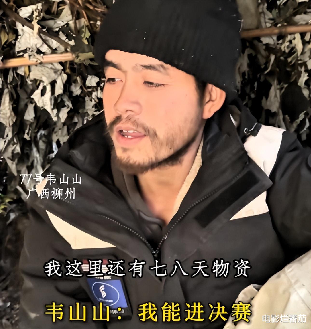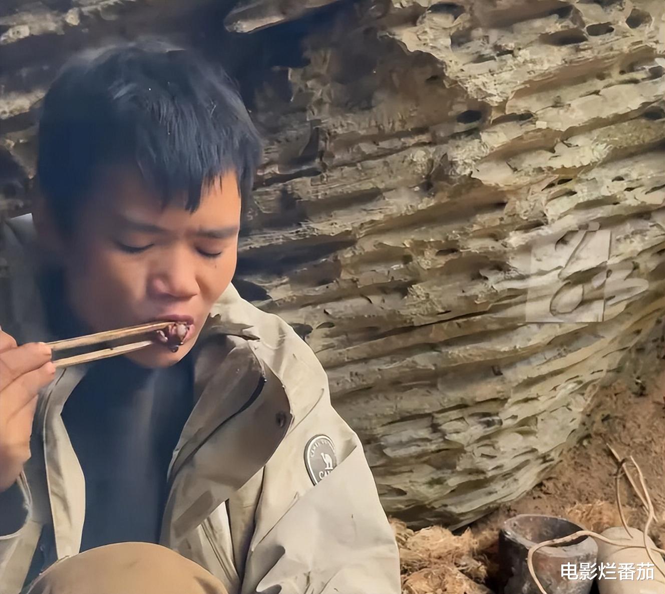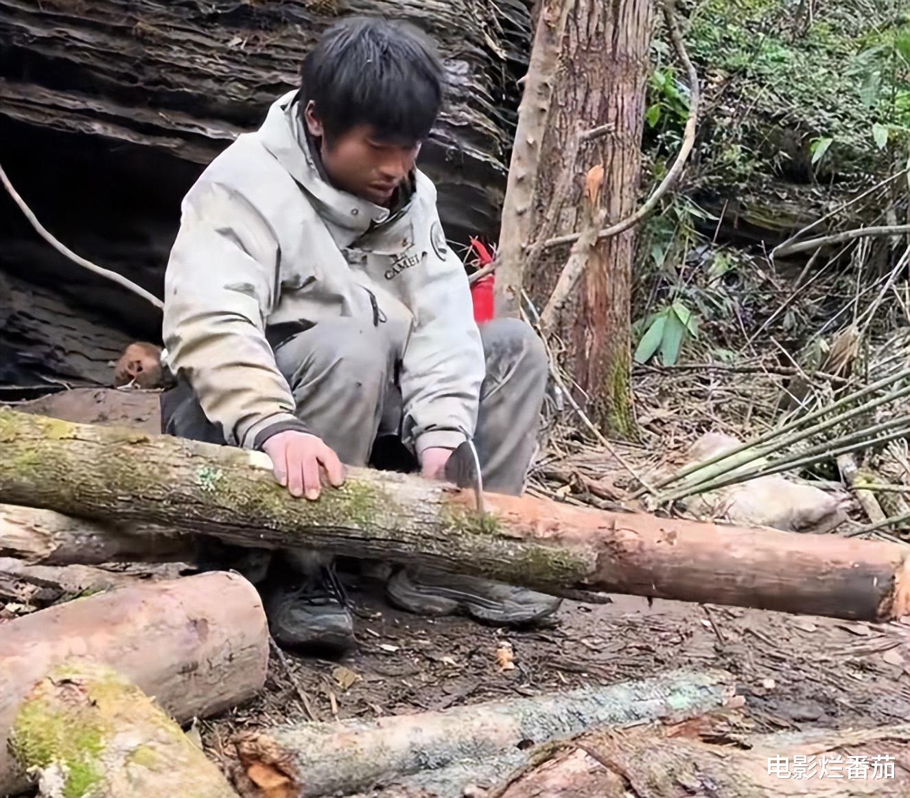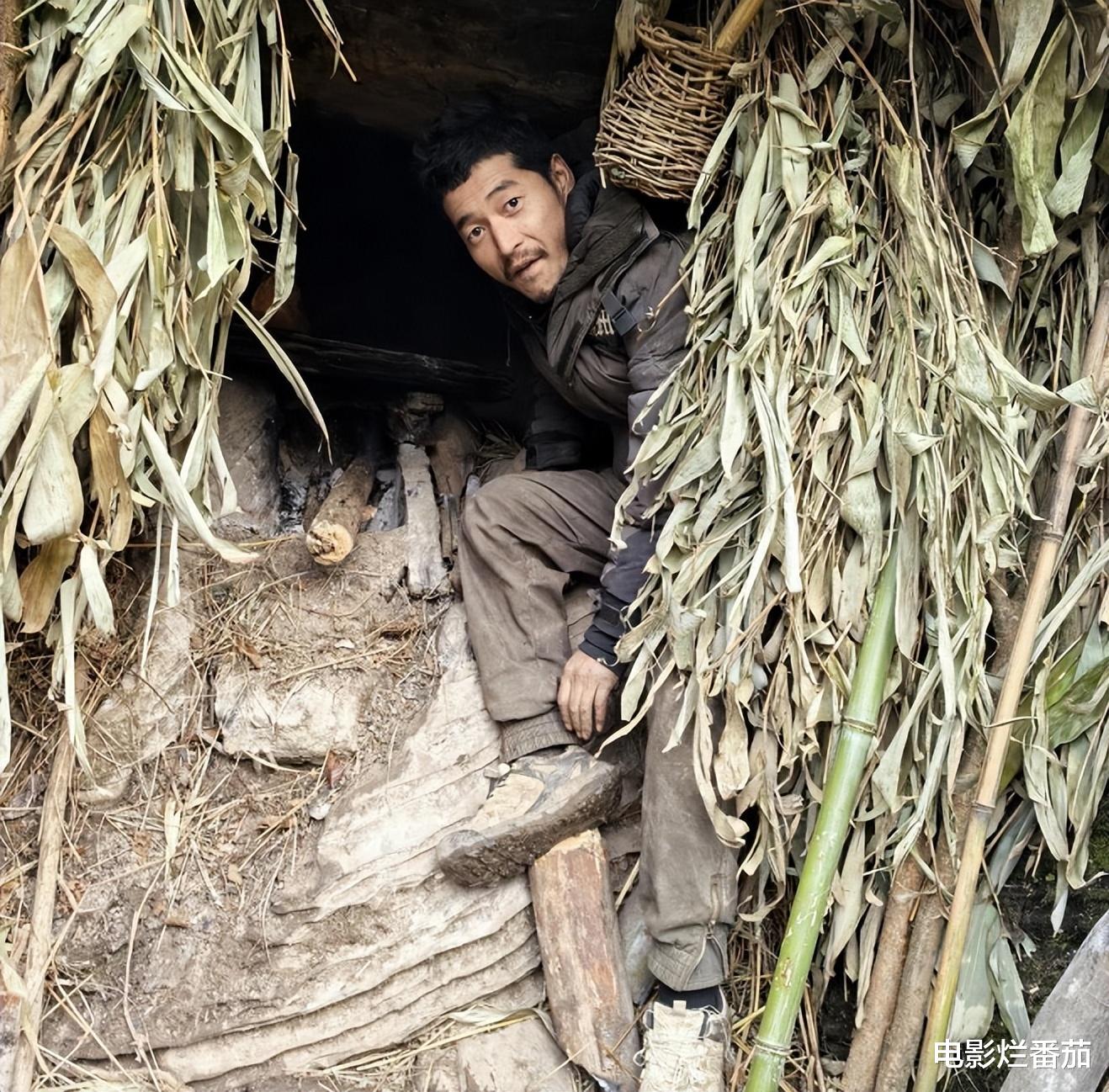 在刚参赛的前半个月,他一直都生不出火,每晚都被冻得瑟瑟发抖,硬是靠着吃折耳根、山药,挺了过来,还用树叶、树枝搭建出了庇护所。