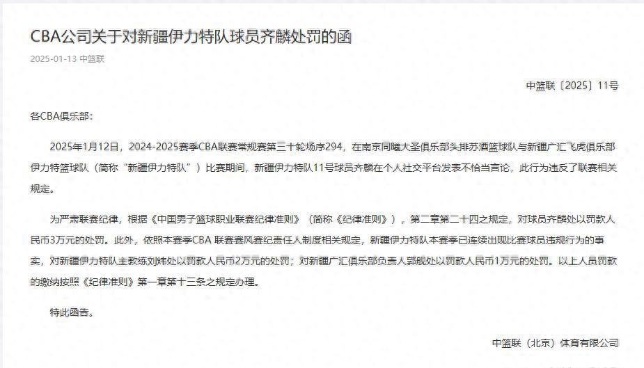 在CBA这个舞台上,球员们的表现不仅仅体现在球场上,场外的言行同样备受关注。齐麟这次因为对裁判的不满而在社交媒体上发飙,结果被CBA罚款3万元。有人说,齐麟这是“初生牛犊不怕虎”,但在职业联赛中,这种“初生”可不是什么好事。CBA的罚款不仅是对齐麟个人的惩罚,更是对整个新疆队的警示。毕竟,球员的言行不仅代表个人,也代表着球队的形象。