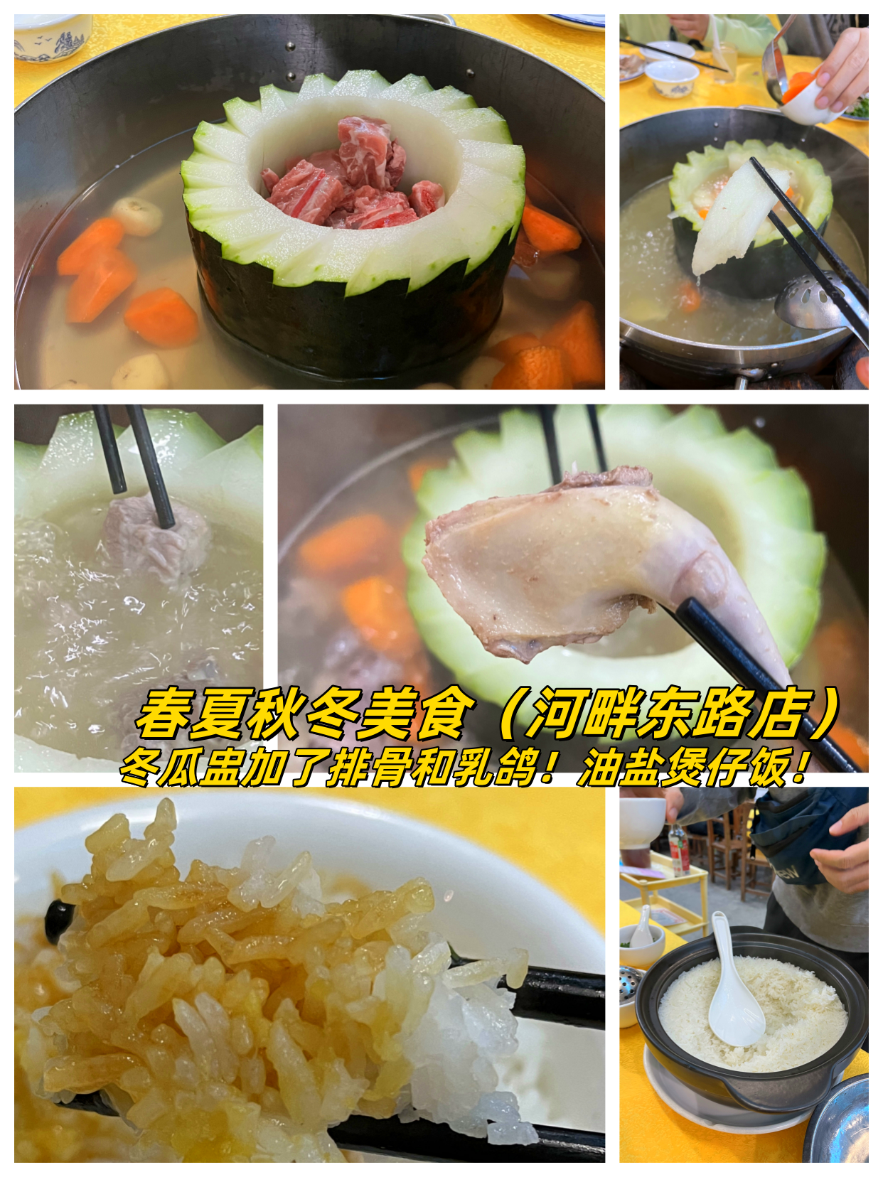 冬瓜盅必点!里面有马蹄、红萝卜、冬瓜肉最后也能吃!我们加了排骨和乳鸽!还点了油盐煲仔饭,火候刚好!