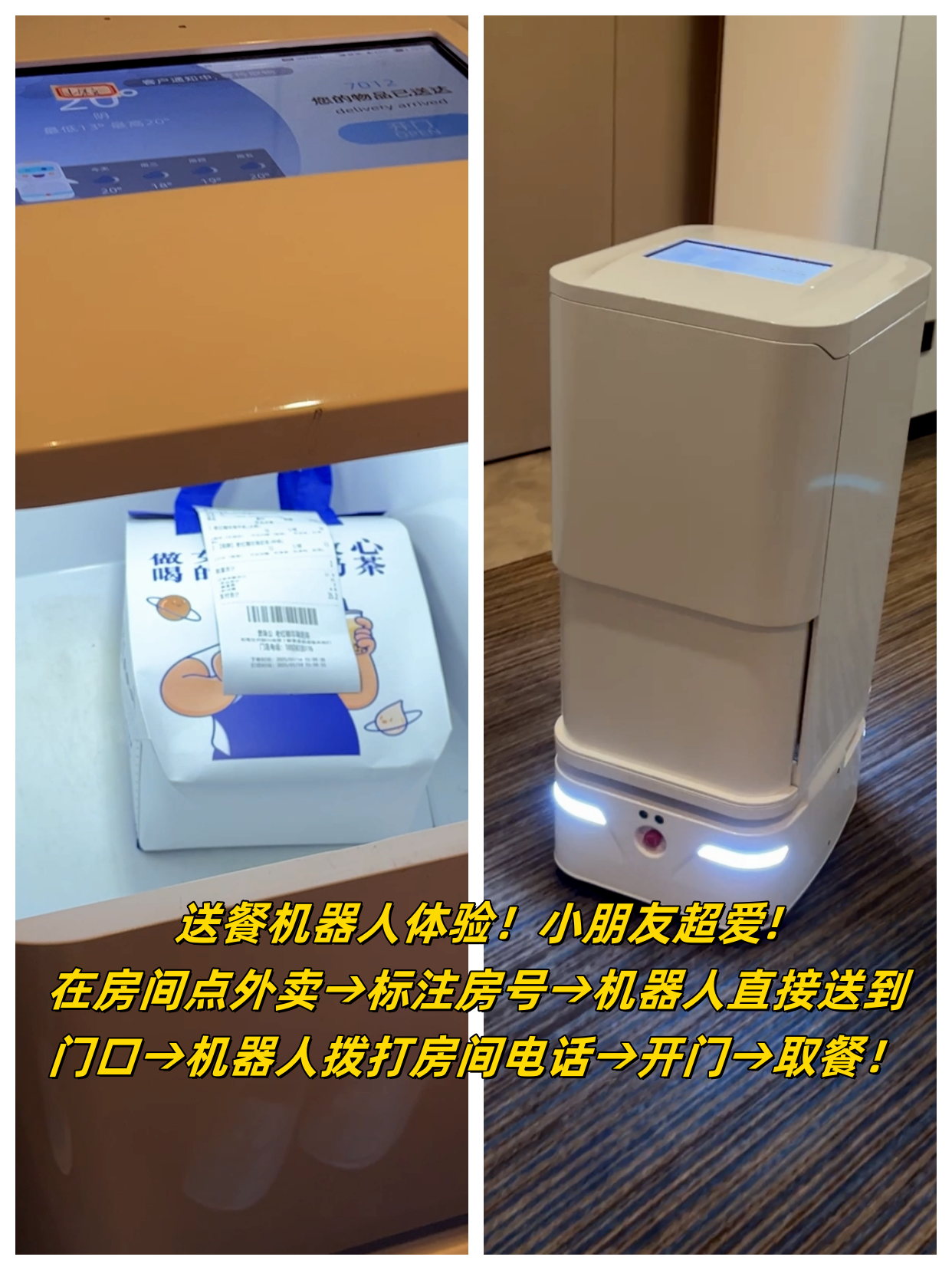 点外卖→备注房号→机器人送到门口→机器人拨打房间电话→你去开门→