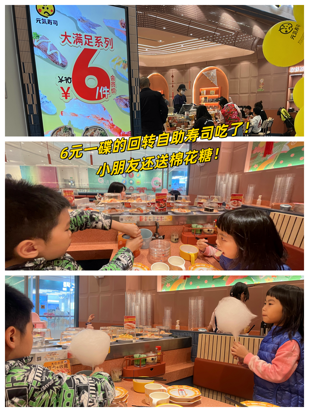 4楼6元一碟的回转自助寿司,见小朋友还送棉花糖!