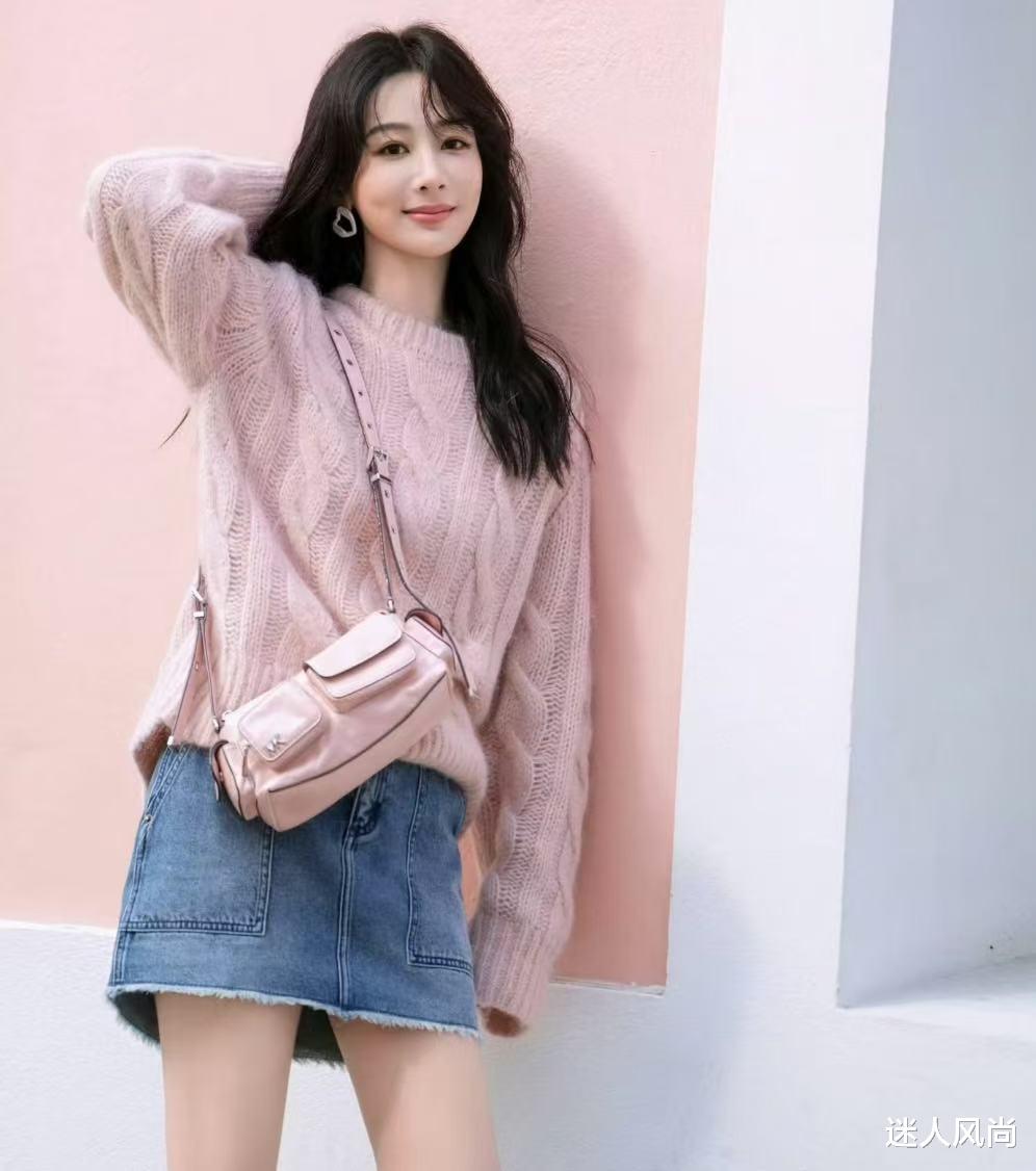 粉色的柔和与蓝色的宁静相结合,能营造出一种浪漫、优雅且柔和的氛围,让人感到舒适和放松,而且减龄效果也特别好。我们看杨紫的这款温柔穿搭,软糯的粉色毛衣,搭配蓝色牛仔短裙,俏皮灵动。