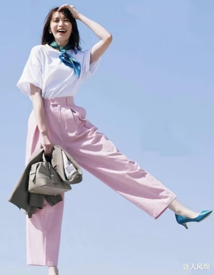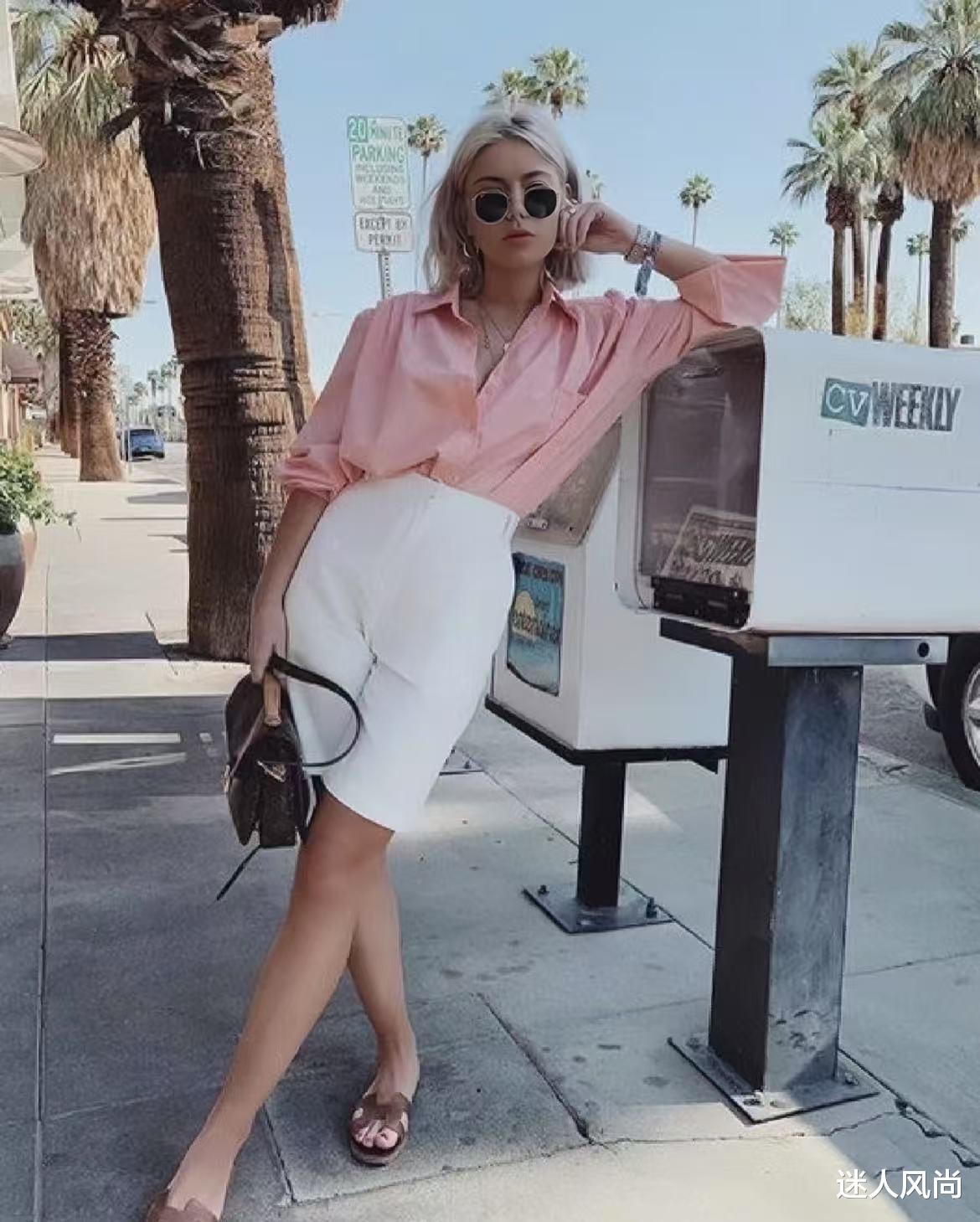 上粉下白(适合黄皮/微胖):淡粉色衬衫的甜美被白色裤子中和,既有女性的柔美,又不失利落感,很适合轻熟风女生。