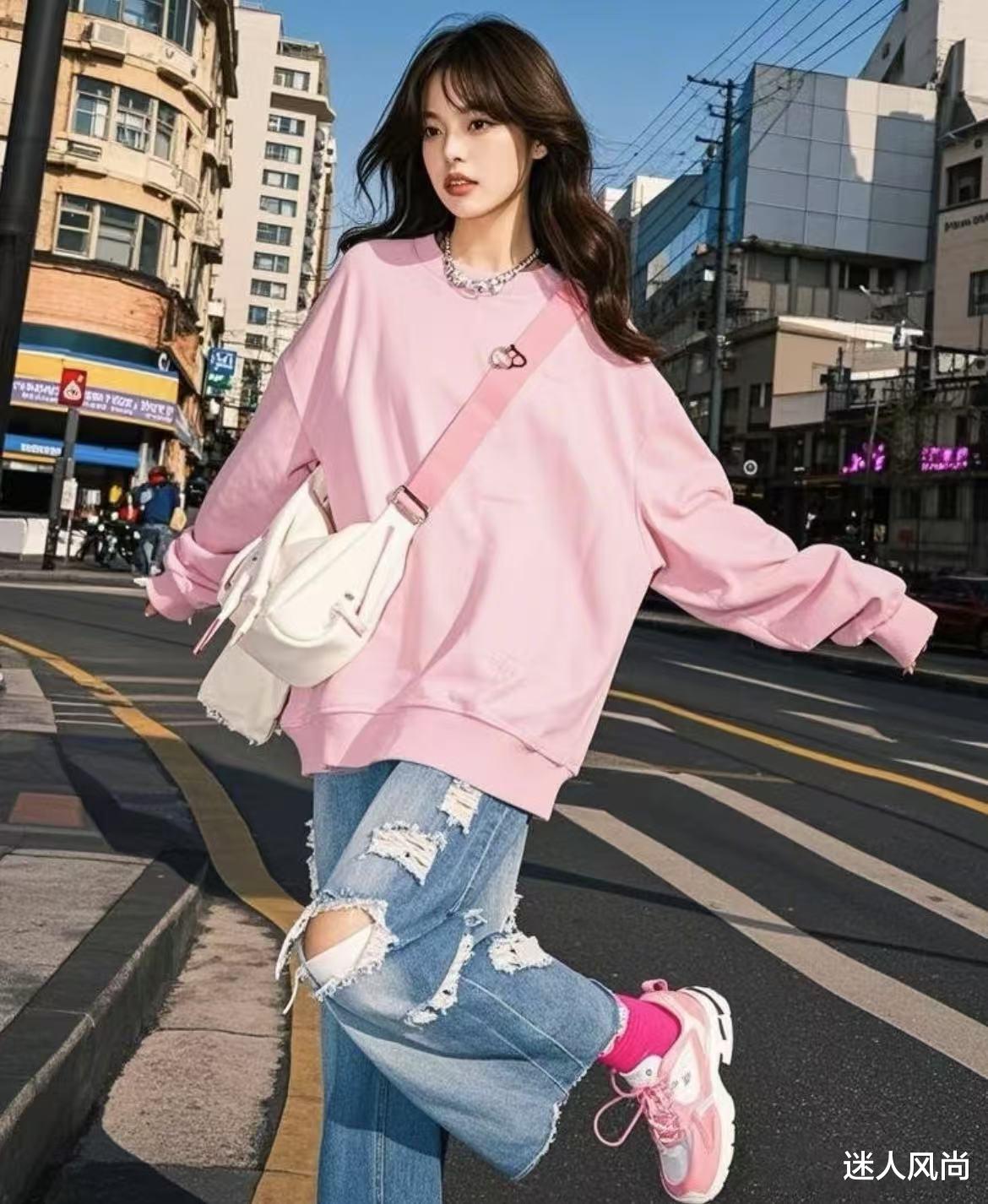 粉色卫衣+牛仔裤=元气少女感(小心机:黄皮选带灰调的“橡皮粉卫衣”,搭配深蓝色老爹裤更显瘦,戴顶白色棒球帽瞬间提升时髦度。)