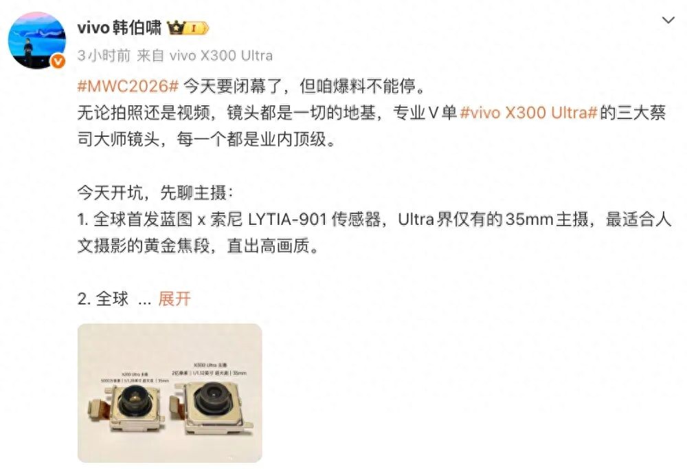 随着时间的推进,vivo今天继续进行超大杯影像旗舰预热。vivo通信科技有限公司产品经理韩伯啸今天的最新消息中介绍了vivo X300 Ultra 的主摄细节。