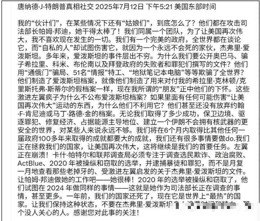 特别是在去年特朗普竞选期间,他曾多次用爱泼斯坦案件来攻击民主党,公开宣称要曝光与“萝莉岛”有关的大人物名单,这份名单被认为包括了多位知名的民主党人士或支持者。这个承诺曾成为许多MAGA支持者的期待,但如今,特朗普却声称爱泼斯坦案件的名单并不存在,这无疑让他们感到被背叛。当时特朗普发布的这篇长文,充满了对司法部长的辩护,而在他的社交平台Ttruth Social上,这篇文章的评论区却充满了反对声,许多MAGA粉丝公开炮轰他。令人意外的是,这篇长文的评论数量甚至超过了点赞数,而以往特朗普的帖子点赞数通常远超评论数,说明不少人对他的立场感到失望。更为微妙的是,Ttruth Social平台的规则也发生了变化,特朗普的帖子不再像以前那样无需注册就能查看,这或许是他为了减少外界对这些言论的关注所采取的手段。