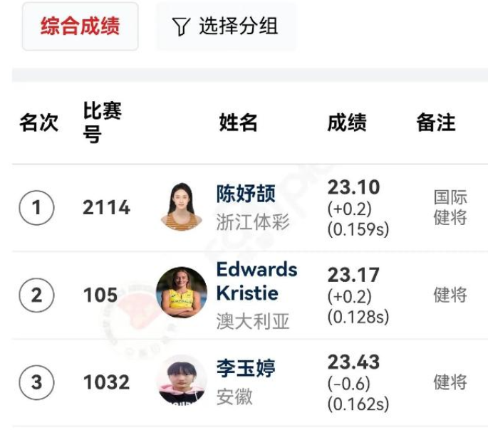 电子屏显示 23 秒 10,陈妤颉夺冠,爱德华兹 23 秒 17 第二,李玉婷 23 秒 43 第三,葛曼棋 23 秒 65 第五,这场逆转看得人直呼过瘾,年轻选手的冲劲太猛了。