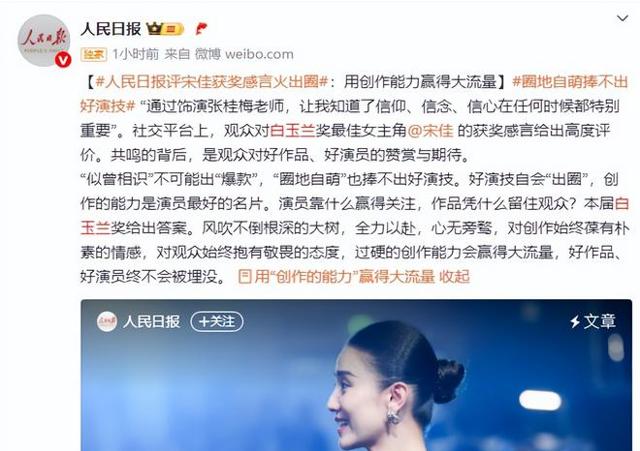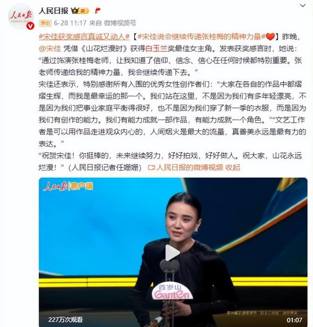 紧接着,人民日报对宋佳的获奖感言表达了高度认可。