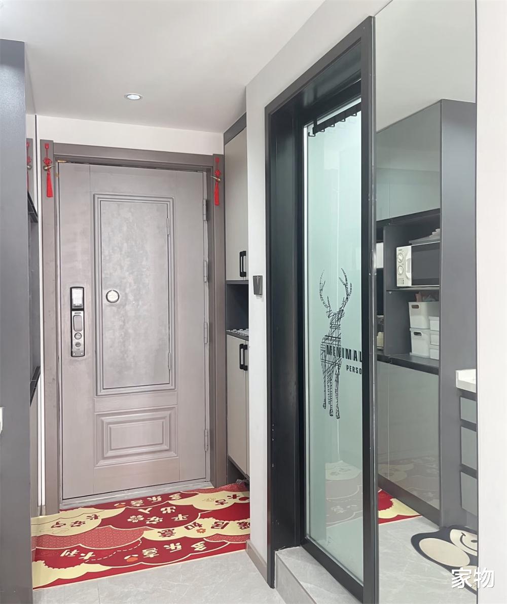 和很多这类蜗居户型相同,一进门都是个窄小的玄关空间,左右两侧预留有安装鞋柜和玄关柜的位置,可以将鞋袜帽子等小件都纳入其中,只留出一条狭窄的,通往室内的过道,看起来倒是整洁干净。