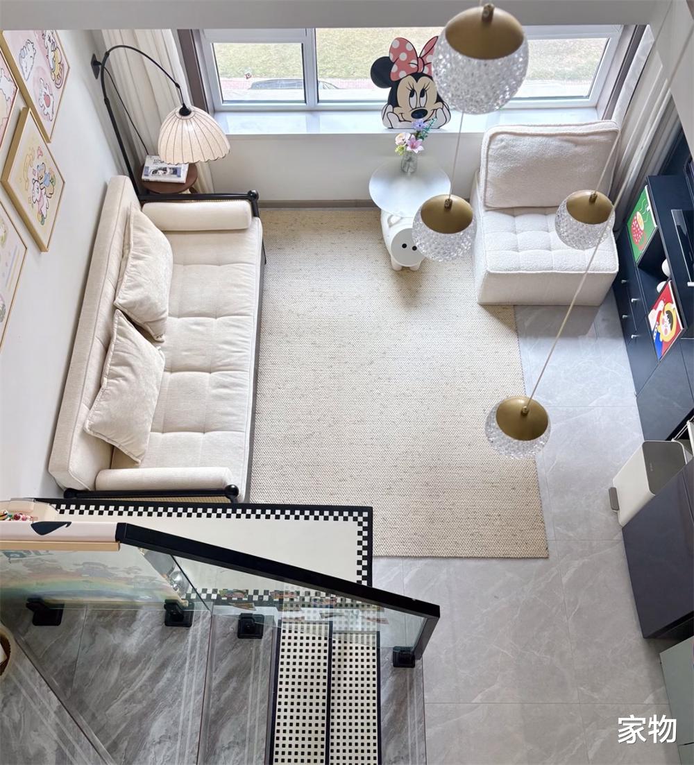 更不用说,这隔层特意避开了沙发头顶的空间,打出一道天井投下光线,既增加了纵向空间的利用方式,又避免了因为隔层导致的采光不足问题,这装修布置,从细节上讲可谓是面面俱到了。