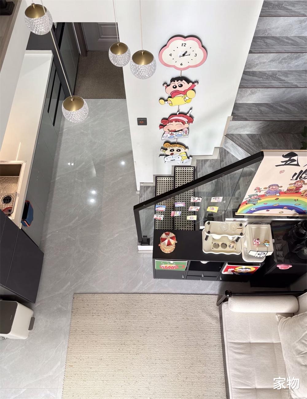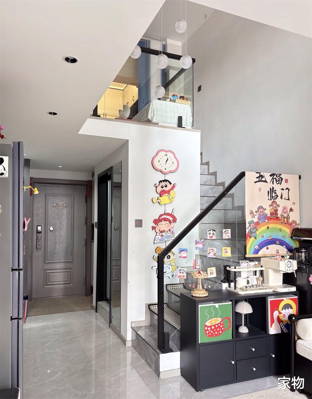 楼梯和隔层上的护栏,都做成了玻璃隔断的样式,既保证了采光和家里的空间通透感,又能避免高处跌落的风险,可谓是一举两得,最关键的是楼梯盘旋而上,每一阶都不算高,安全性大大提升。