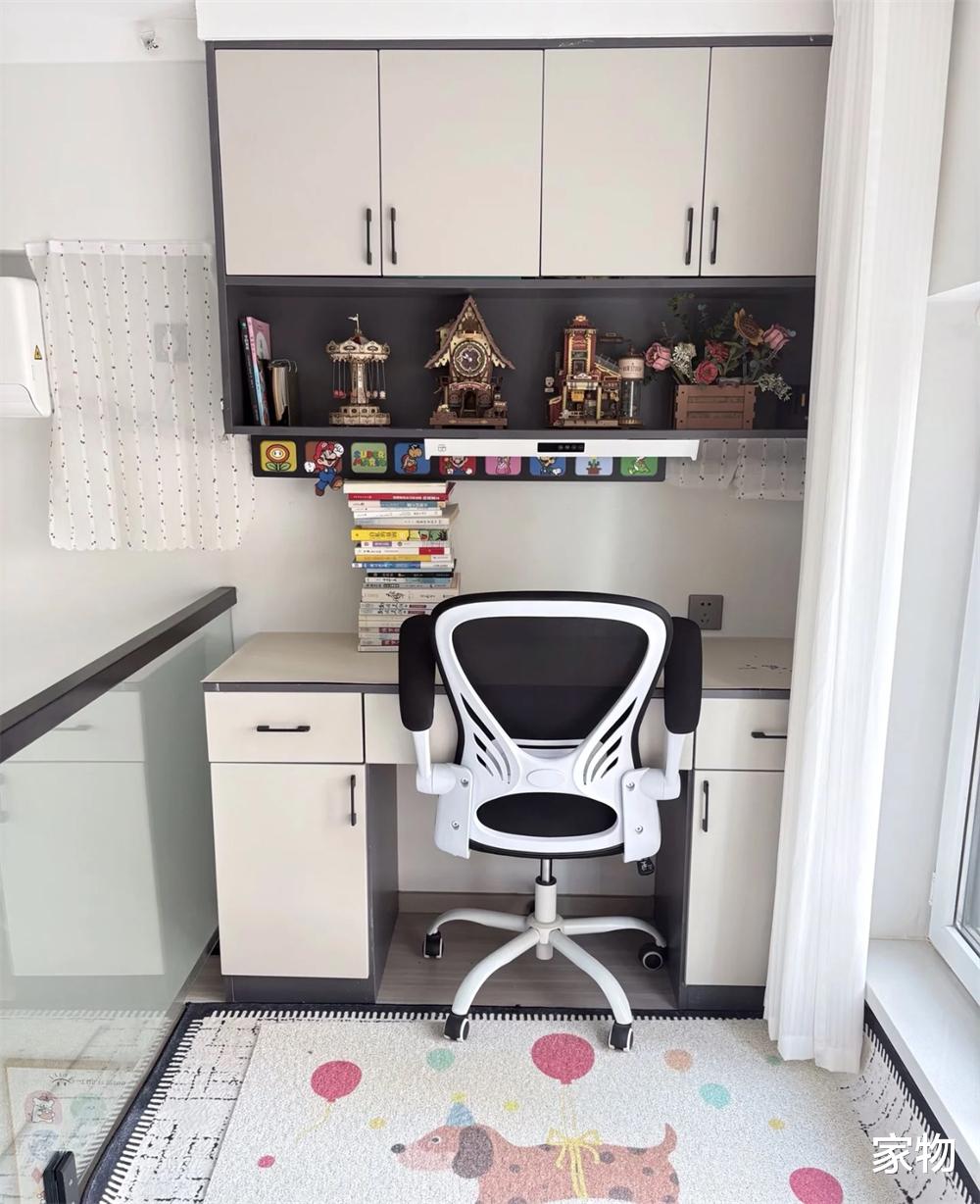 靠窗的位置,则布置成一个简单的书桌办公区,平时在这学习、办公、玩游戏,采光绝佳的同时,也相当于是个专门的小书房,想想这只有20㎡的蜗居,能有如此多的生活区域划分,我真的挺佩服的。