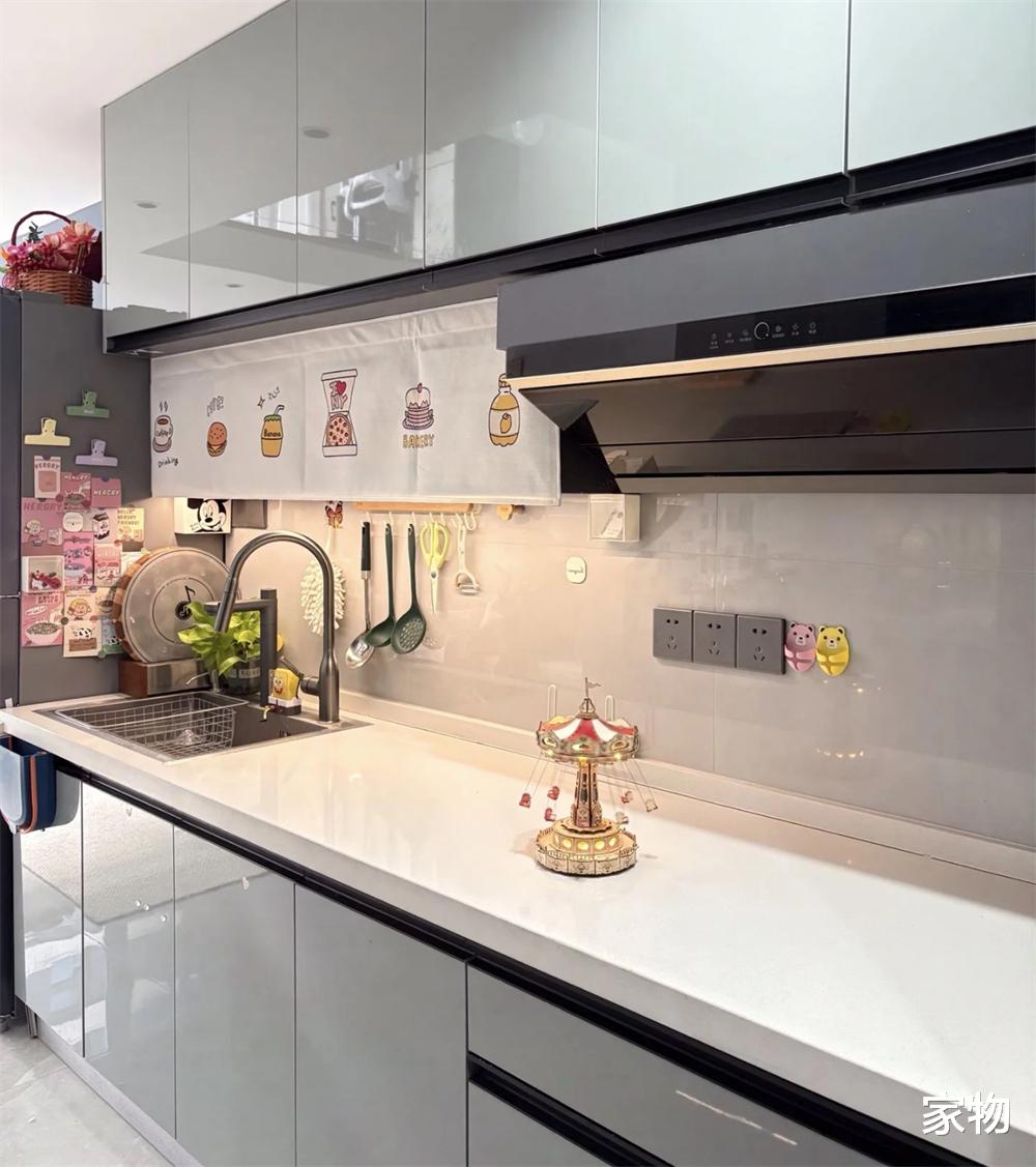 小公寓不能用明火灶具,但可以用电磁炉和各种厨电进行烹饪,平日里做些简单的饭菜完全够用,哦对,亮面橱柜也让这间厨房变得更方便打理,实用性颇强。