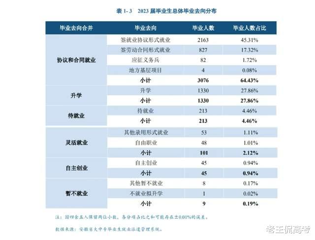 学校的就业质量还是很不错的。根据它发布的2023届毕业生就业质量年度报告,截至2023年11月2日,学校2023届毕业生毕业去向落实率为95.35%,基本实现充分就业。其中签就业协议形式就业为毕业生主要去向选择,占比为45.31%;升学次之,占比为27.86%。从这个数据上来看它的毕业去向落实率中水分还是比较少的。其中大数据与会计(会计学院)、物流信息技术这2个专业都实现了100%就业。