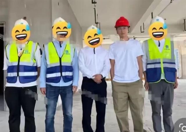结果走近一看,好家伙,他居然戴着红色安全帽,在工地上走来走去,和身边的工作人员认真交流,时不时还指指点点,原来他是在选址监工!
