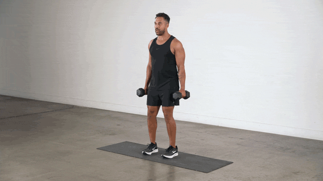 双脚踩住弹力带两端,双手持带,手掌朝上缓慢弯举至肩,再控制下降。