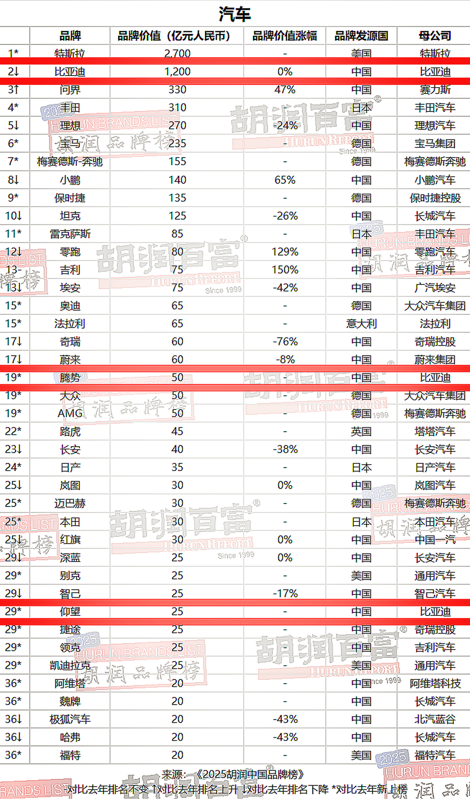 2025年胡润榜单改了规则,首次把特斯拉、丰田、宝马等国际车企也拉进来PK。说白了,以前是国内自己比,现在是放到全球市场里真刀真枪地比。结果,迪子依旧以1200亿元的品牌价值第四次蝉联中国汽车品牌第一。新规则下跟国际巨头同台竞技,依然能守住中国汽车品牌的老大位置,足够说明了它的品牌价值不是依赖保护,而是经得过市场考验。