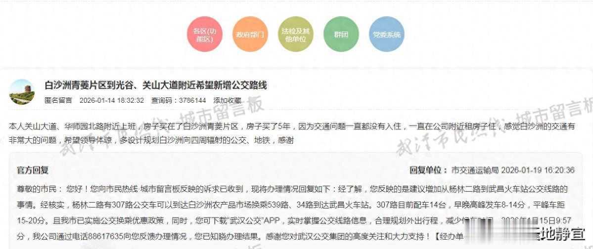 官方回复:经了解,您反映的是建议增加从杨林二路到武昌火车站公交线路的事情。经核实,杨林二路有307路公交车可以到达白沙洲农产品市场换乘539路、34路到达武昌火车站。307路目前配车14台,早晚高峰发车8-14分,平峰车距15-20分。且我市已实施公交换乘优惠政策,同时,您可下载“武汉公交”APP,实时掌握公交线路信息,合理规划外出行程,减少候车时间。