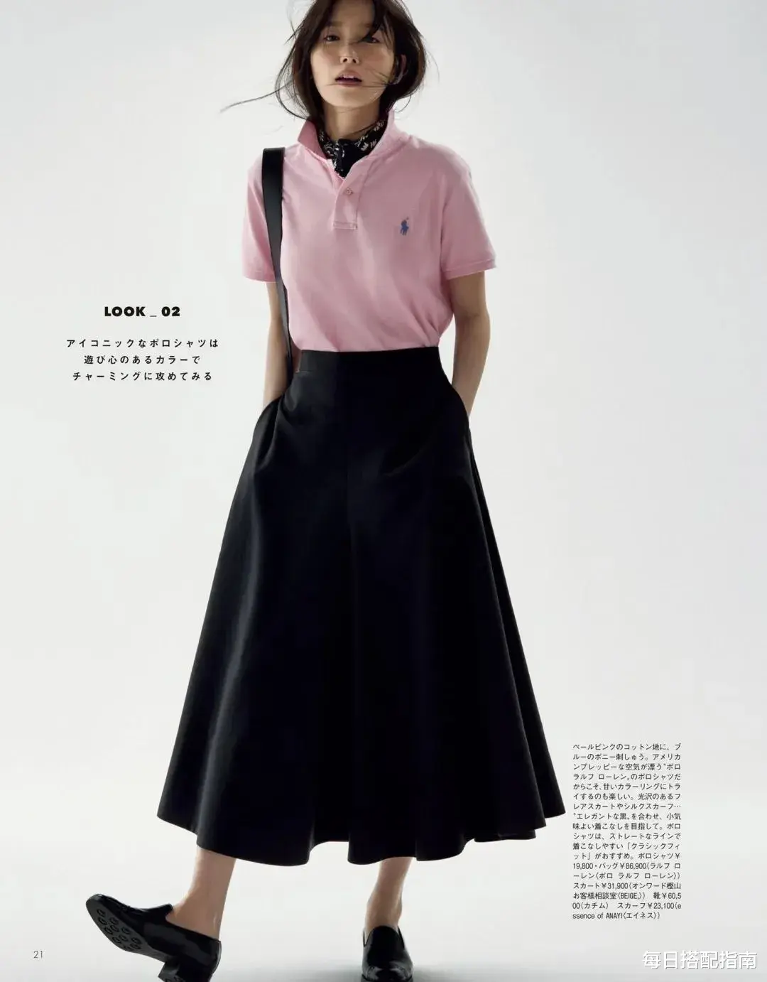 举个例子,如果半裙与乐福鞋选用经典的黑色、米色、灰色等基础色,那上衣可以适当选柔和的淡粉色、浅蓝色或者温柔的杏色,让整体造型更具活力又不失沉稳。