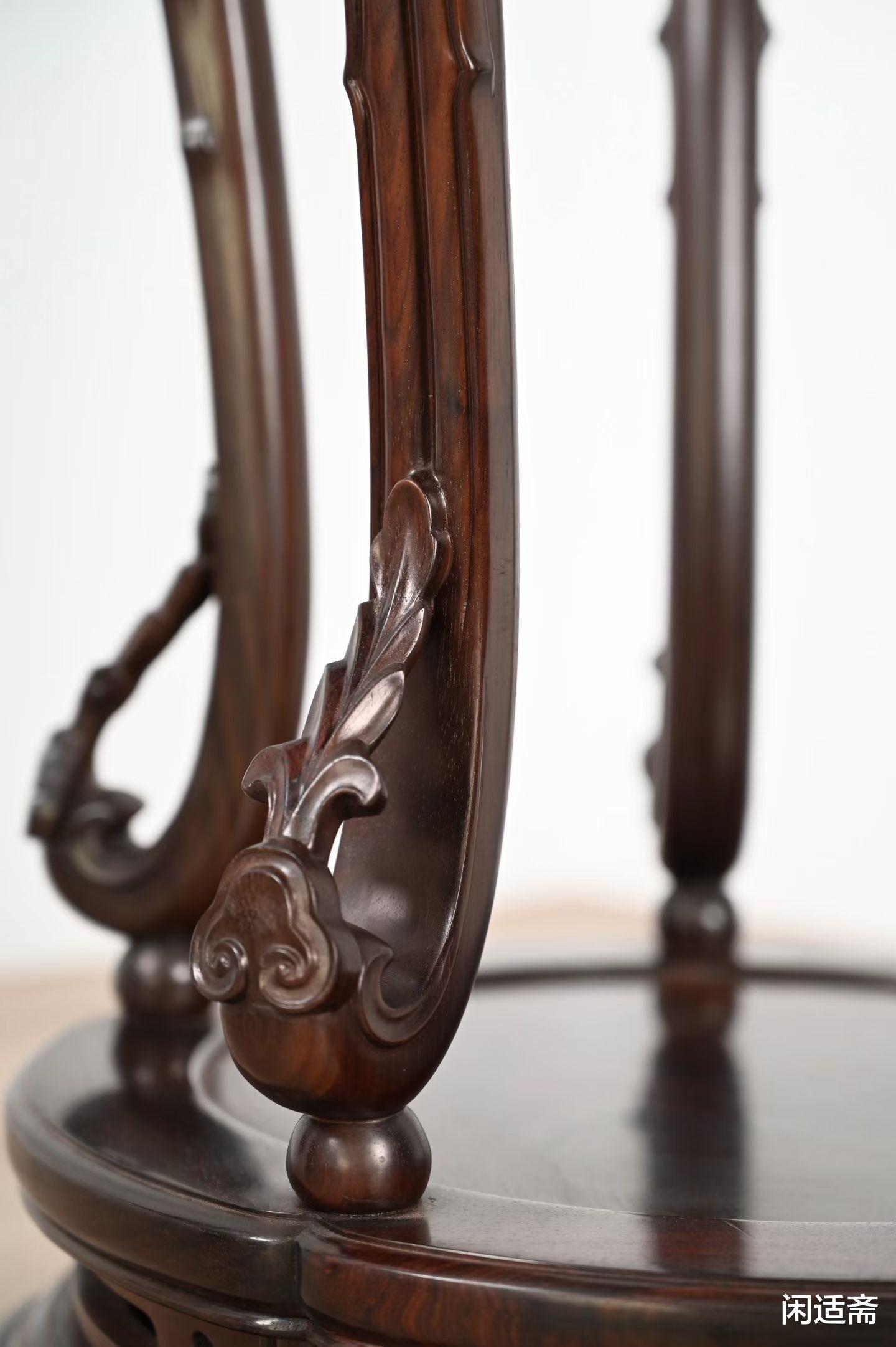此香几甄选优质大红酸枝精制而成,质地致密坚硬,密度极高,上手厚重沉稳,自带内敛华贵的质感。香几面为圆形攒框装板,采用经典三弯腿五足设计,腿部线条婉转流畅,自上而下呈优美的弧形,弧度拿捏精准,柔中带刚,尽显明式家具的线条之美;五足均匀分布,稳固扎实,既保证了香几的承重力,又彰显了古人“天圆地方”的营造智慧,是中式家具中极具代表性的经典形制。