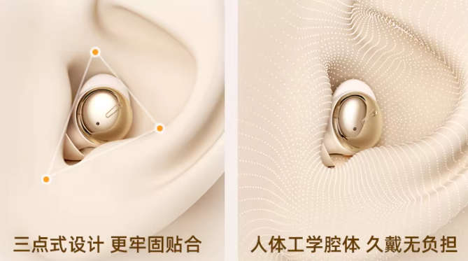 佩戴极致舒适,采用行业首创的 mini 超软抗菌耳帽,搭配人体工学的腔体适配设计,依托三点式结构,最大程度减轻耳部压迫,专为耳廓定制的贴合形态真正实现 0 压空气感佩戴,久戴完全无疼痛感,侧睡时也不会硌耳。同时贴心配备多款不同尺寸的耳帽,精准适配各种耳廓造型,让不同人群都能找到贴合自己的佩戴方式,细节满满。