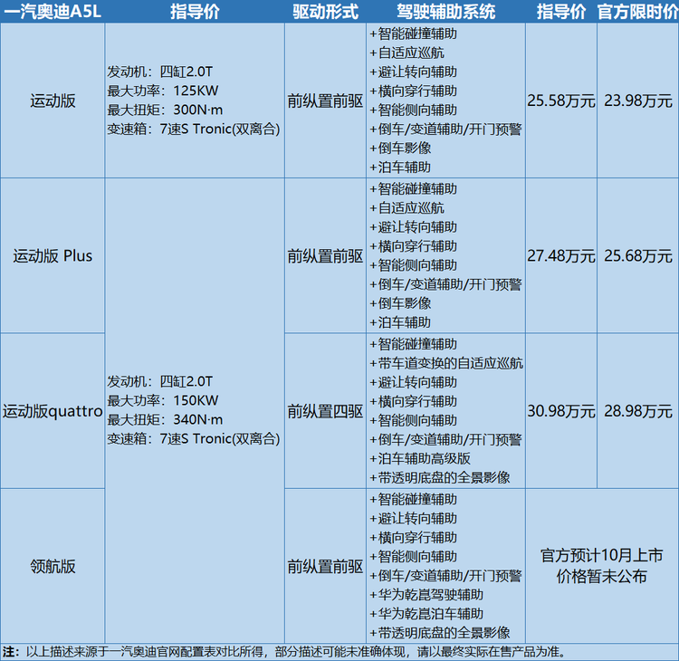 本次上市的一汽奥迪A5L 采用125KW前驱,150KW前驱和四驱,三种动力形式,均配备直列四缸2.0T发动机,配置方面值得注意的是除了传统配置的升级,全新A5L采用多种驾驶辅助方案,其中运动版、运动版Plus标配了自适应巡航、泊车辅助、倒车影像;运动版quattro配置了带车道变换的自适应巡航、泊车辅助高级版、带透明底盘的全景影像;领航版则配备了具有华为乾崑技术的驾驶辅助和泊车辅助系统、带透明底盘的全景影像(详见本文官方配置表附图)。