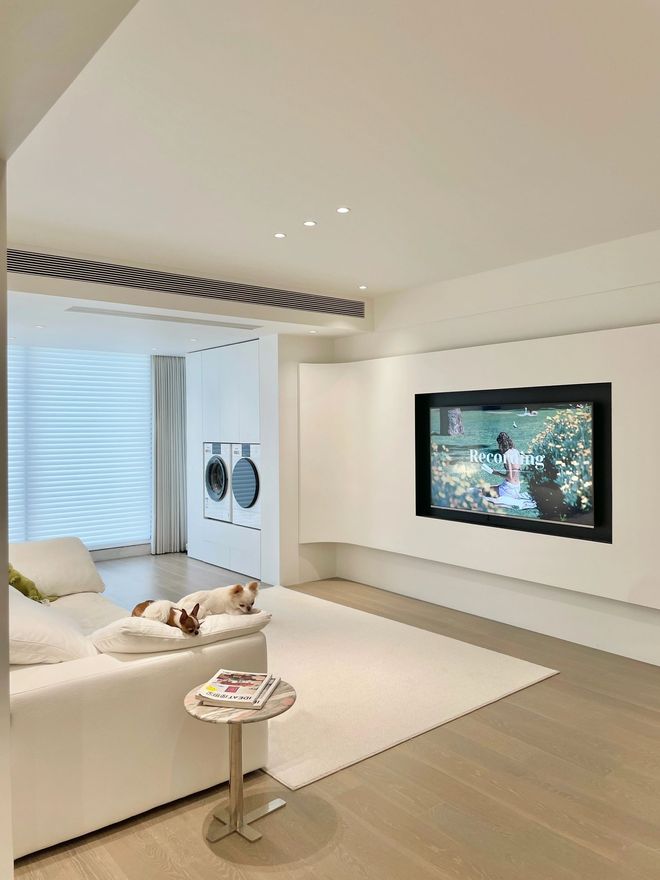 沙发、地毯的颜色,和墙面、天花板的奶油白是保持一致,就连室内门都选择了同样的颜色,视觉感更加整洁。