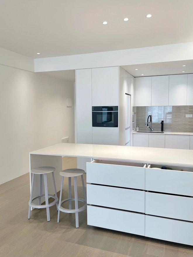 橱柜是“三面柜”是一体式的设计,操作台面遵循了“拿-洗-切-炒”的烹饪动线,下厨既方便又顺手。