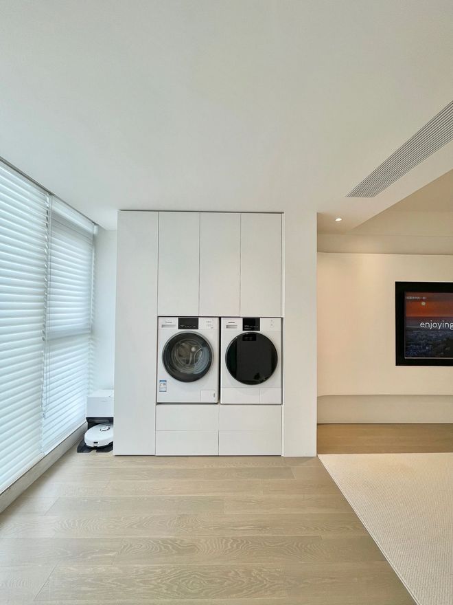一般来说,如果阳台要放洗衣机和烘干机,都会采用叠放的方式,但是拿取衣服并不方便,为了解决这个问题,屋主便抬高了洗衣机、烘干机的位置,并做了平行设计,使用时无需弯腰,更实用!