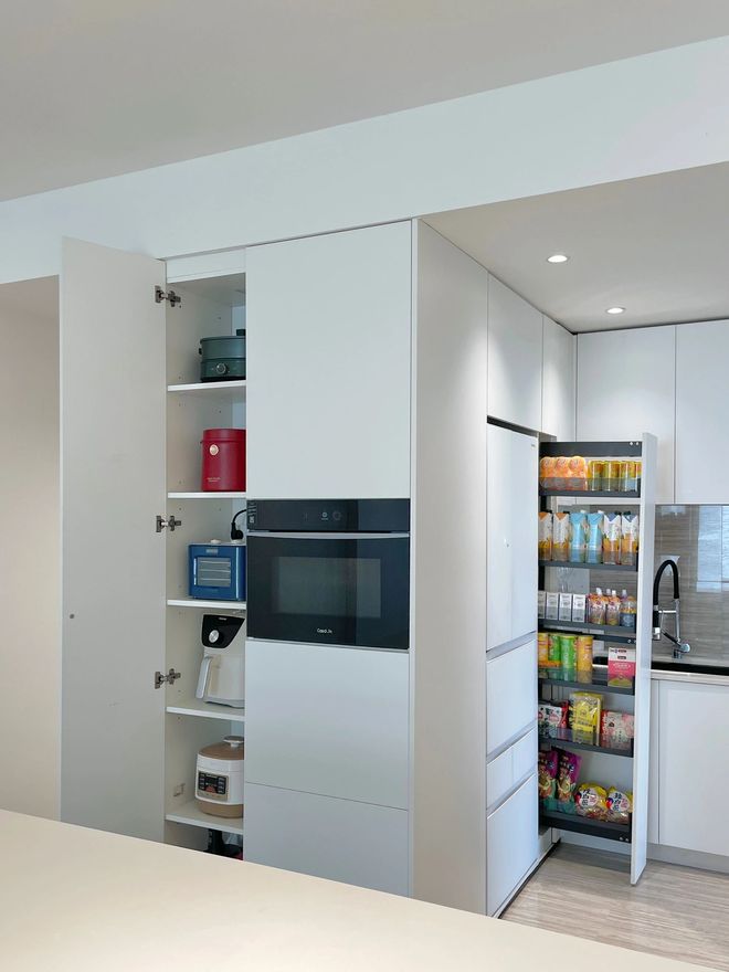 面向餐厅一侧的柜体,安装了三扇柜门,中间嵌入了烤箱,柜内空间以隔板设计为主,主要用来收纳小厨电。