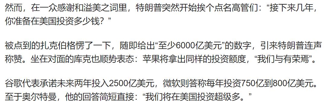 当白宫鸿门宴那晚,扎克伯格说投资6000亿、库克说投6000亿、谷歌投入2500亿、微软每年750亿到800亿,特朗普就像一个资本教父,点名罚单,科技巨头一个个低头叫好,