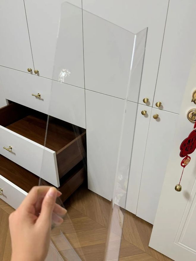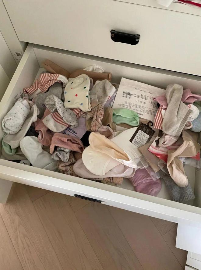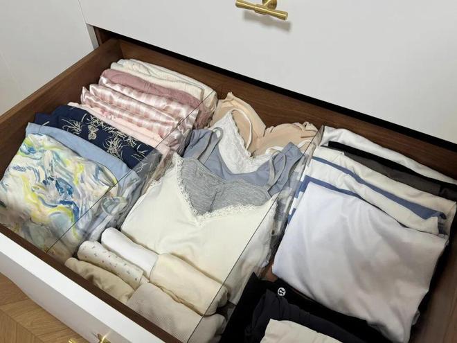 可若用亚克力板给它分隔一下,让每种衣物都有固定的区域,那么自然就会整齐秩序,而且一拉开就一目了然。