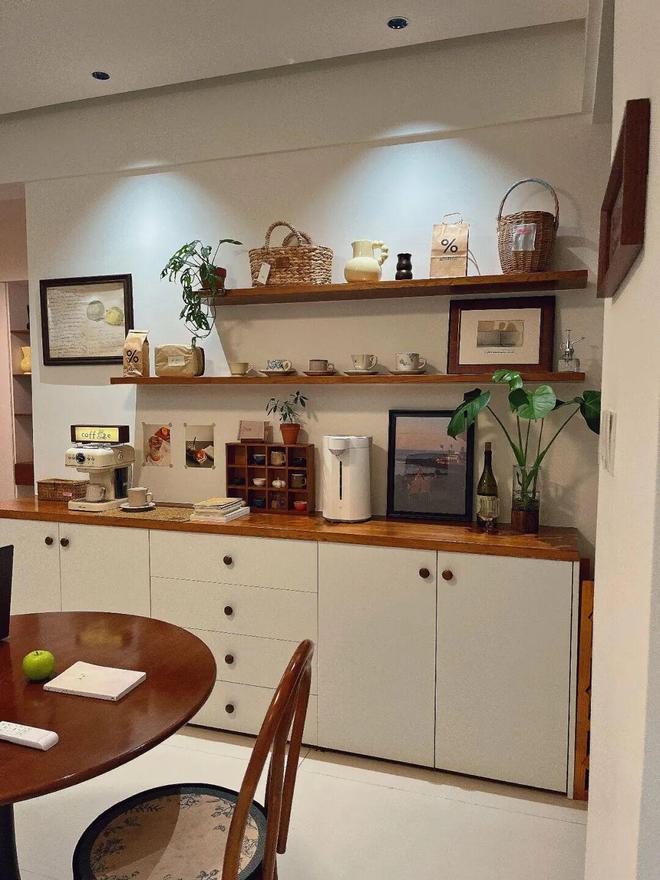 比如餐边柜+墙面搁板组合,既能收纳杯碟,又能摆放装饰物,灯光一打,确实温馨又治愈。