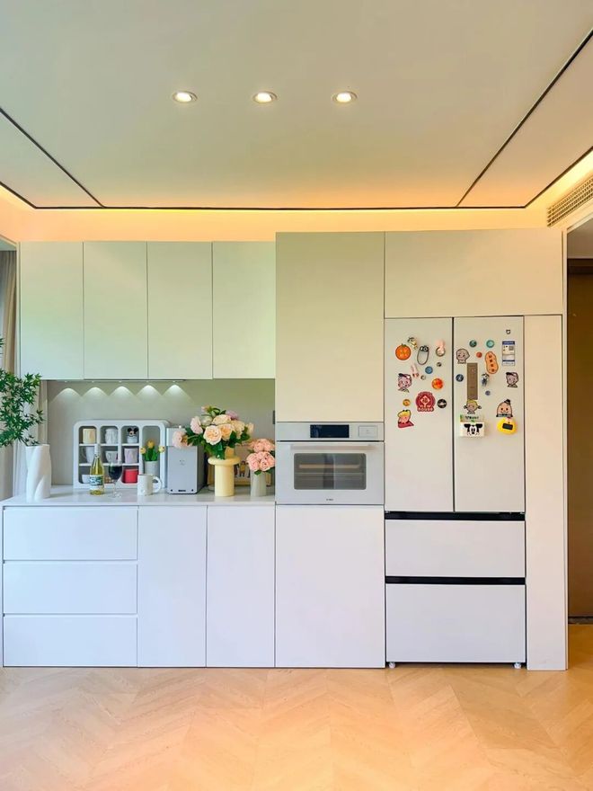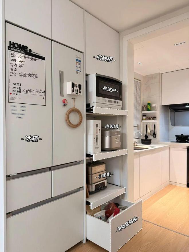 1)冰箱:可以嵌入到餐边柜或者厨房柜子里,记得购买零嵌入式冰箱,别什么冰箱都往柜子里藏,避免影响散热和使用。
