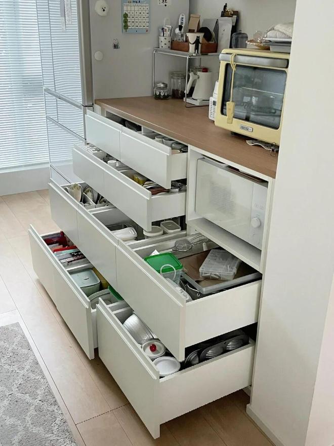 所以,千万不要低估抽屉的收纳力,只要它能让你做到“取放顺手”,甚至比柜子还要好用。