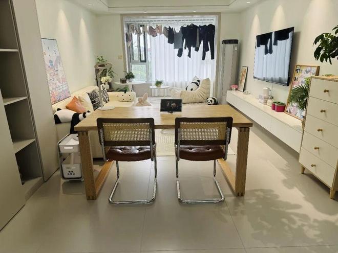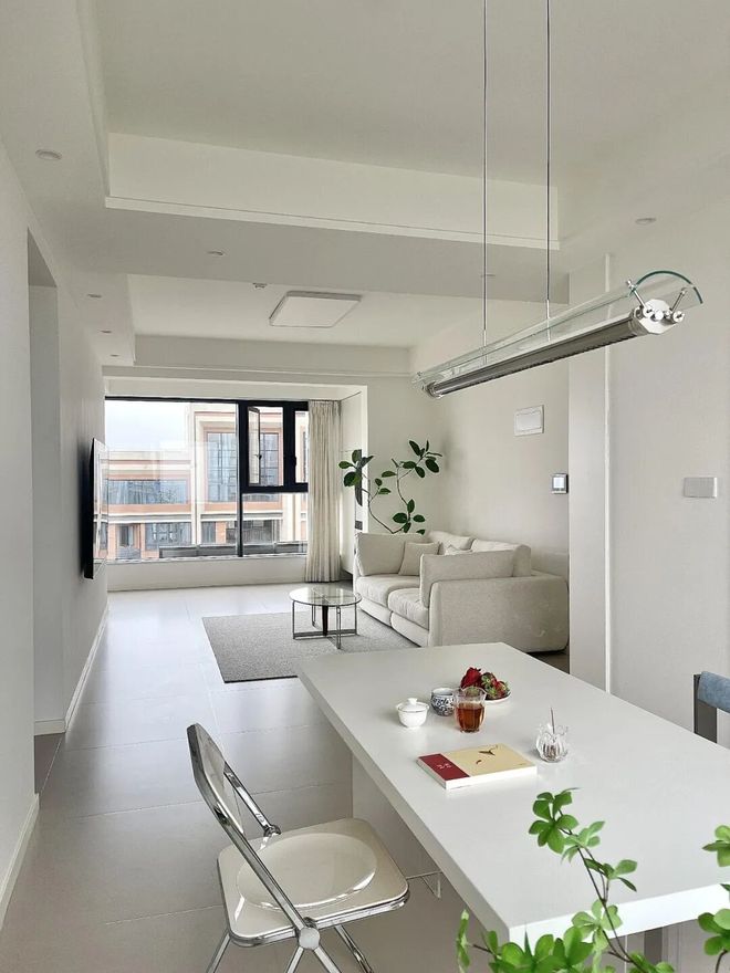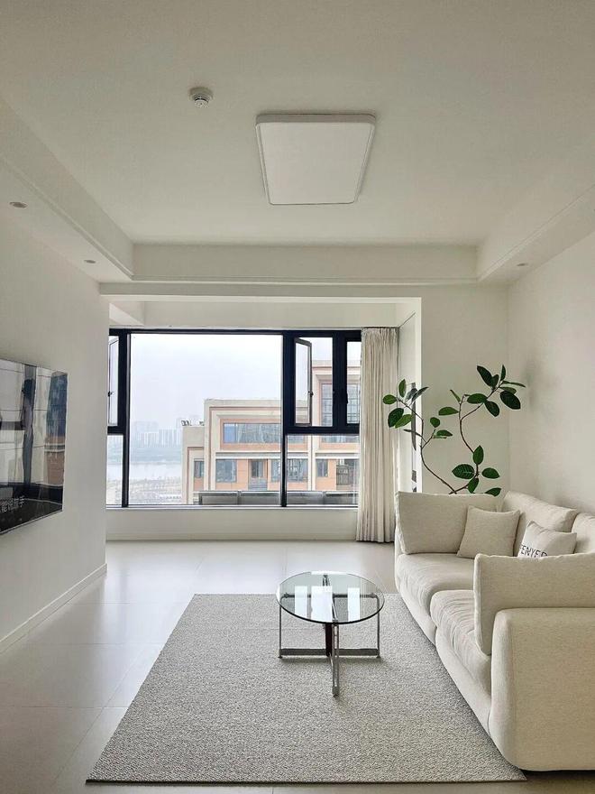 就以网友@川洋家为例,地面柔光砖通铺,墙面无装饰,顶面设计吊顶,再通过浅色系家具衬托,宽敞又通透,而且还十分耐看。