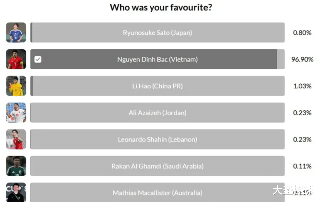 佐藤的排名甚至落后于中国门将李昊,后者目前的得票率为1.03%。