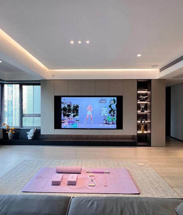 客厅区域电视背景墙设计的真心很不错啊,电视背景墙设计满墙收纳柜,电视内嵌进去,非常完美!底下岩板地台。柜门颜色还蛮高级的。