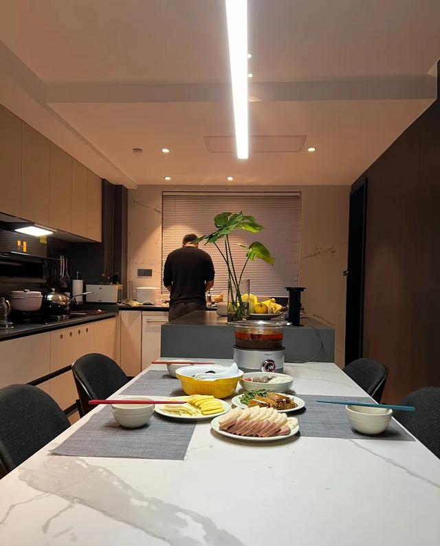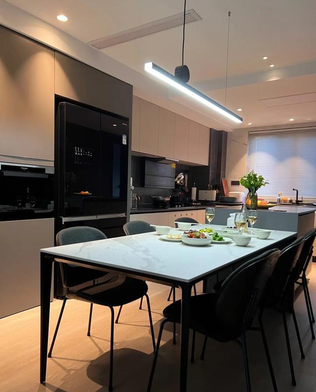 餐厅区域餐厅区域改动还挺有自己想法的,厨房和餐厅区域整体打通,餐厨一体式设计。