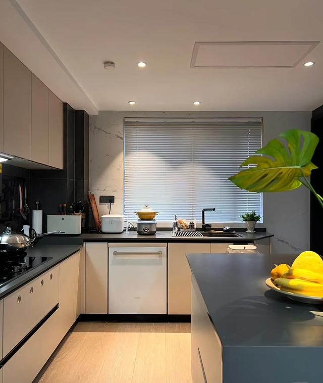厨房区域这么一改,空间看着比较开阔,橱柜L型布局,柜门灰色平板门,台面深灰色,高低台设计。水池台下盆工艺。