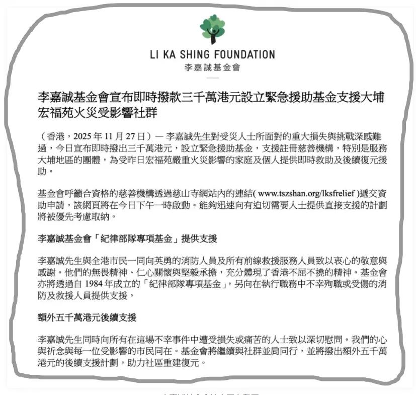“香港传真”的报道说,李嘉诚基金会宣布:即时拨款3000万港元设立紧急援助基金支援大埔宏福苑火灾受影响社群。 此外,基金会将提供额外五千万港元后续支援。