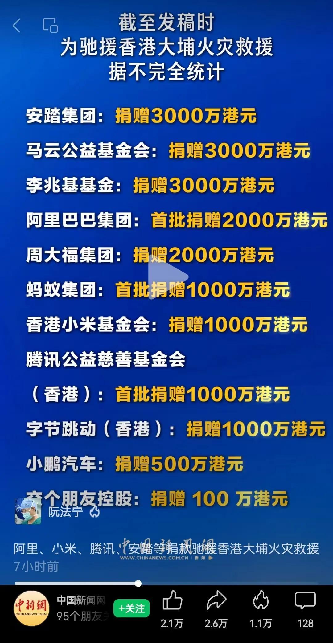 微信视频号“中国新闻网”的报道称,大埔火灾发生后,阿里、小米、腾讯、安踏等捐款驰援火灾救援。猪肉佬T先生看完大字看小字,发现“据不完全统计”的名单里,并没有目前为止捐款最多的李嘉诚基金会的名字。