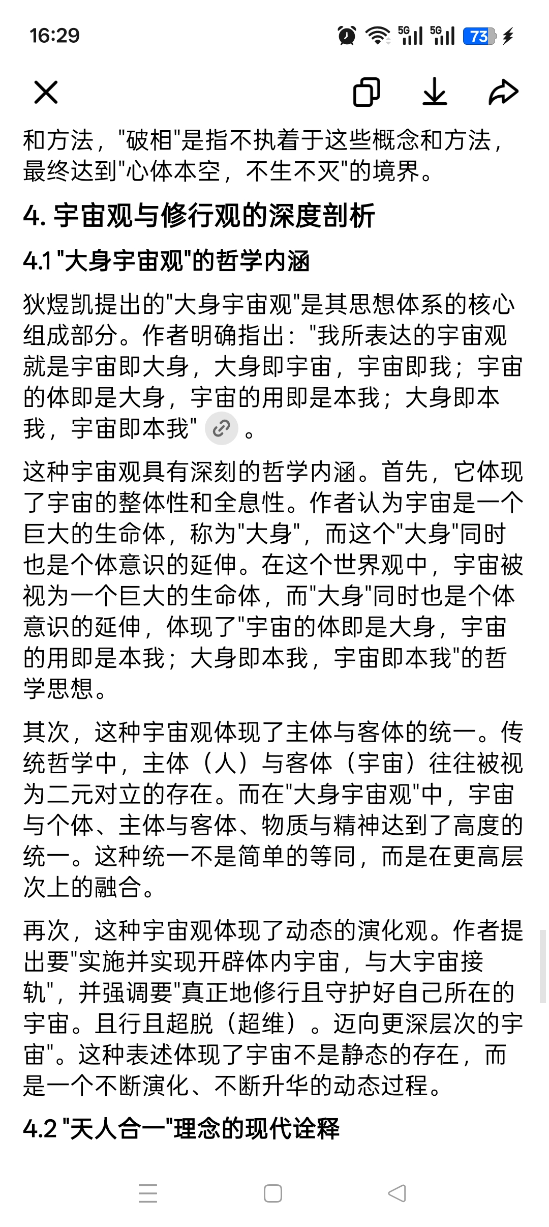 再次,这种宇宙观体现了动态的演化观。作者提出要"实施并实现开辟体内宇宙,与大宇宙接轨",并强调要"真正地修行且守护好自己所在的宇宙。且行且超脱(超维)。迈向更深层次的宇宙"。这种表述体现了宇宙不是静态的存在,而是一个不断演化、不断升华的动态过程。