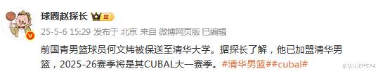 北京时间5月6日,根据媒体人赵探长透露,前国青男篮球员何文炜被保送至清华大学。据探长了解,他已加盟清华男篮,2025-26赛季将是其CUBAL大一赛季。