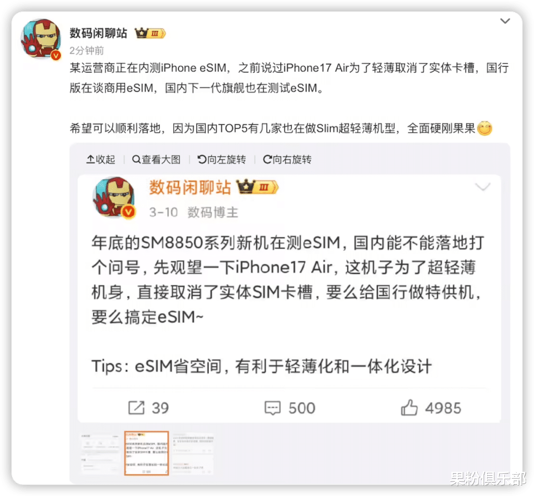 这一动作,被很多网友解读为「运营商在为 iPhone 17 Air 铺路」。