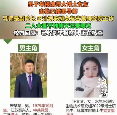 这两天南师大在网上比较火,因为博导宋某和女博士汪某的爱恨情仇被扒,大家了解到原来表面上的师生关系,背地里竟然道貌岸然,谈起了地下情。